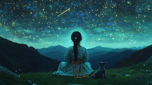 A 10-year-old Korean girl dressed as a bodhisattva, wearing prayer beads on her wrist, sitting on a green hill under a night sky filled with twinkling stars and a shooting star. The girl's back is turned towards the viewer, sitting beside a small dog, with a serene and beautiful landscape around them. The bodhisattva's robes emit a soft, subtle golden glow that illuminates her figure, painted in the style of a serene and tranquil oil painting with elements of nature, soft lighting, and subtle color gradients, conveying a sense of peace and beauty, --ar 16:9