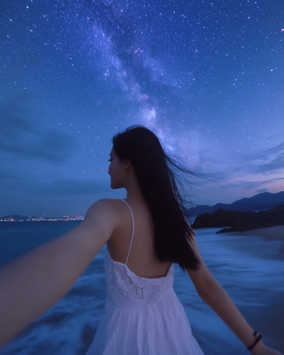 4K,first-person view, boyfriend pov of sweet-looking 22 years old korean woman, the woman is wearing a white mini dress, black hair, hair spread out, large innocent eyes and a mega cute smile, extending her hand invitingly ; Starry night sky with a vivid Milky Way, soft twilight glow transitioning to night, serene coastal landscape with gentle waves, subtle city lights in the distance, harmonious blend of deep blues and purples, creating a tranquil and expansive atmosphere, Canon EOS R5, 50mm f/1.8; soft evening light; fantasy scene. --ar 4:5 --style raw --v 6.1
