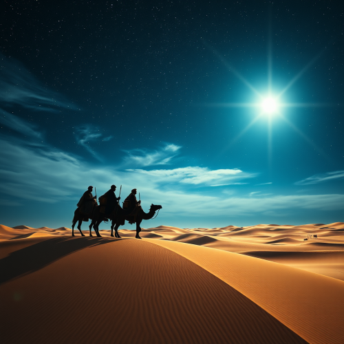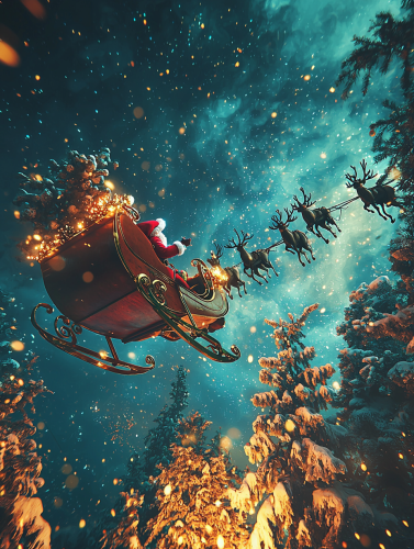 A magical Christmas night sky with Santa Claus flying in his sleigh pulled by reindeer, fantasy illustration, bright colors, high resolution, hyper-realistic, super-detailed, wide-angle lens, cinematic, full-body shot, natural lighting, HDR, high-octane render, in the style of [Studio Ghibli] --ar 3:4 --v 6.1 --q 2