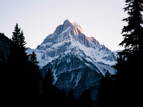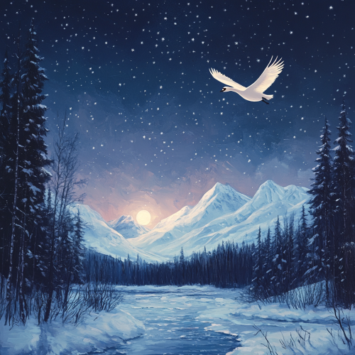 a swan in the foreground flying under clear starry night over snowy taiga forest with mountains in the background. mystic atmosphere, sunrise and hope