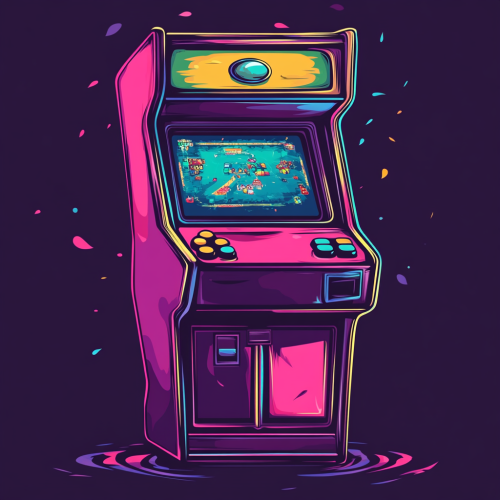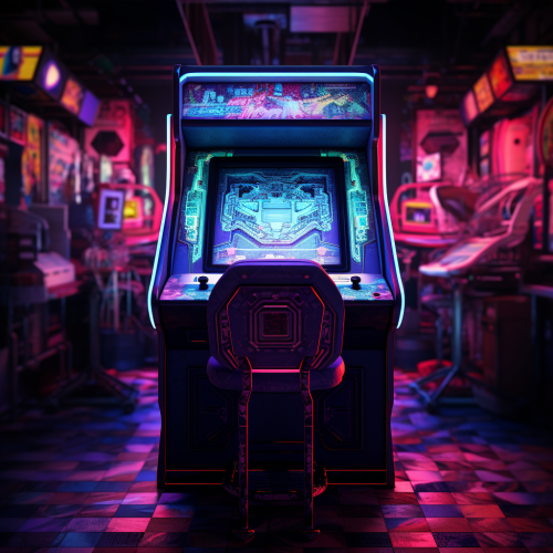 A fully frontal arcade game machine with neon noir and pixel art aesthetics. The image is dark with subtle illuminations generated by the neon elements of the machine.