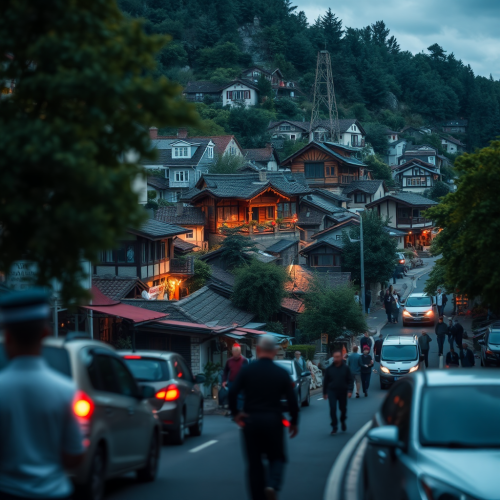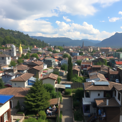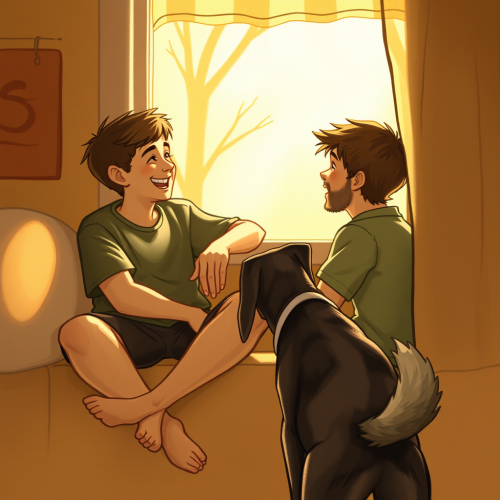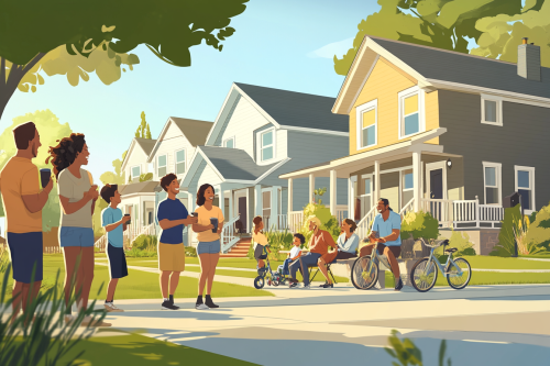 A scene depicting a diverse group of happy residents in a modern, welcoming neighborhood, standing or sitting outside well-maintained homes. They are engaged in friendly conversations, smiling, and enjoying the community atmosphere. Some people are holding coffee cups, while others are playing with their pets or watching children ride bicycles. The background features clean, tree-lined streets, lush green lawns, and a few residents waving from their porches. The lighting is warm and inviting, giving a sense of comfort and togetherness. --ar 3:2