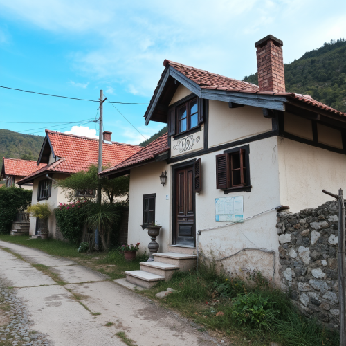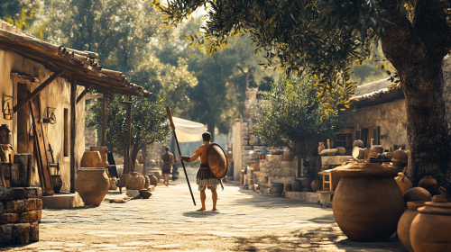 Young hoplite training with wooden weapons in a quiet village square, being taught by an elder hoplite, a calm afternoon, olive trees and pottery workshops nearby. Hyper Realistic HD photos --v 6.1 --ar 16:9