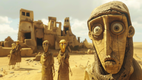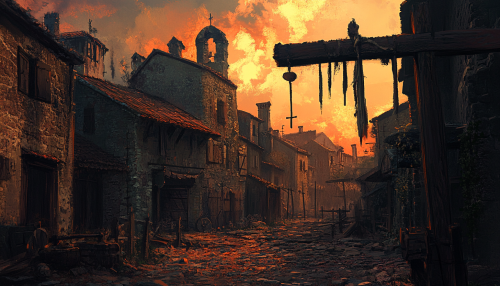 Grimdark fantasy. Greek Mythology. Exterior shot of a town square with gallows. Greek village. Concept art In the style of Steve McNiven. High contrast bright color pallette of warm colors. Gritty action. --ar 7:4 --v 6.1