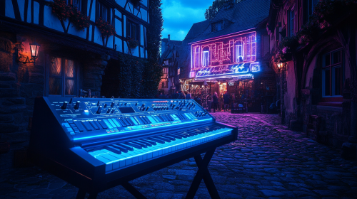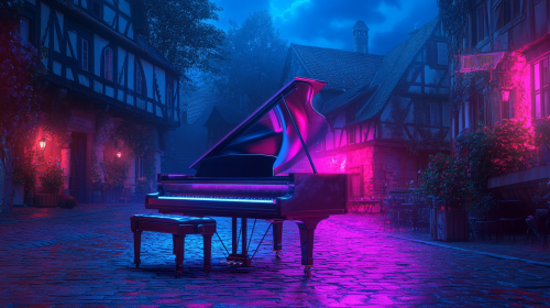 an ethereal image of a high tech grand piano in a 17th century german village square, rimlit neon, concealed lighting, blue neon, pink neon, striplit, atmospheric, beautiful --ar 16:9 --v 6.1