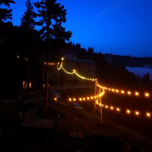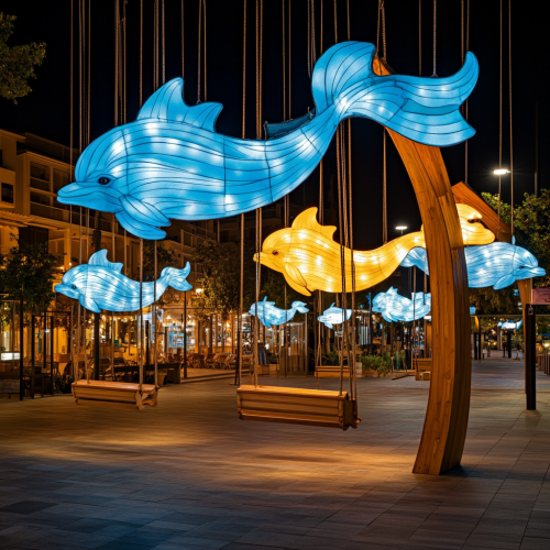 HD image of a square in Riccione at night with bright lanterns in the shape of dolphins in the waves, in the center of the square there is a large wooden swing for children