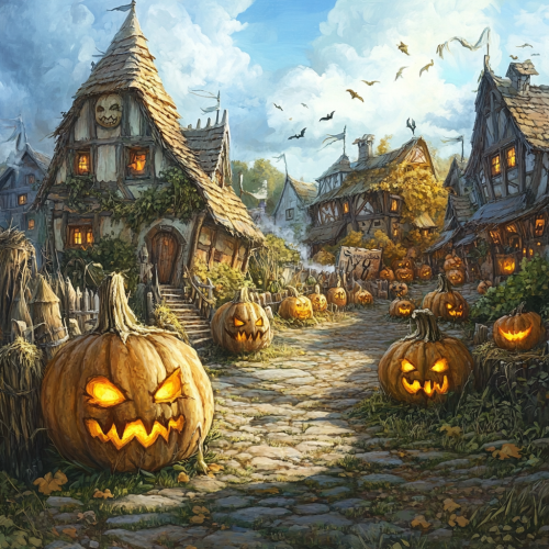 a top down dungeons and dragons battle map, dusk, the town square of a village, interesting streets, it is decorated with Jack o' lanterns and straw effigies, harvest festival, dungeons and dragons map