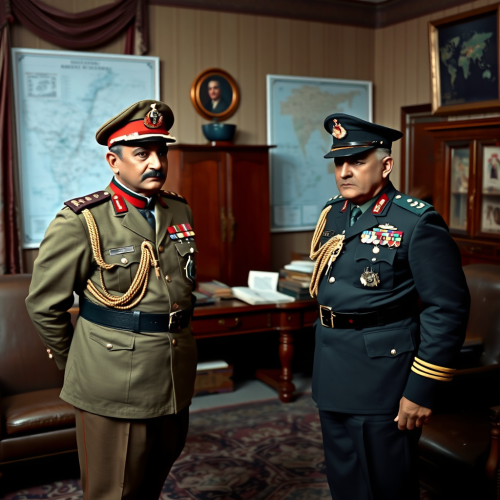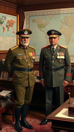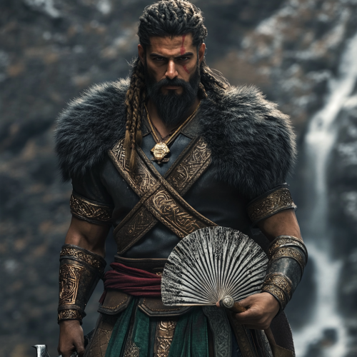 A fierce yet noble Viking-Pakistani character, blending elements of Viking and South Asian attire. He wears a fur-lined leather vest over an intricately patterned shalwar kameez, with bronze armbands and a curved dagger at his waist. In his hands, he holds a beautifully crafted, ancient-looking fan adorned with Norse and Pakistani designs, symbolizing his family’s fan-making heritage. His long beard and braided hair give him a commanding presence, as he stands confidently against a backdrop of windswept cliffs and valleys.