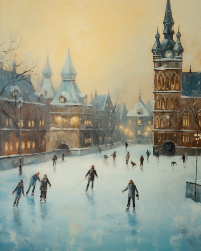 antique oil painting, people are ice skating in an ice skating rink in a snowy village's main town square in front of the old city hall in the evening, blue beige evening colors, moody neutral colors, moody winter aesthetic, vintage aesthetic --ar 4:5
