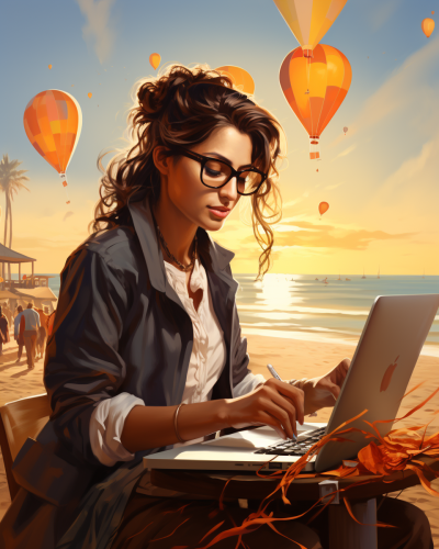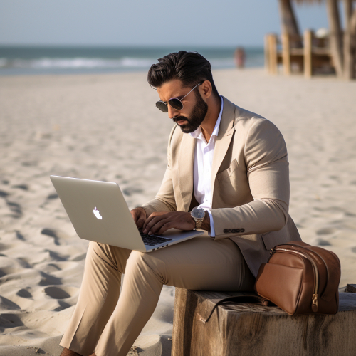 Pakistani entreprenuer working on his laptop on the beach, realistic, smart casual attire