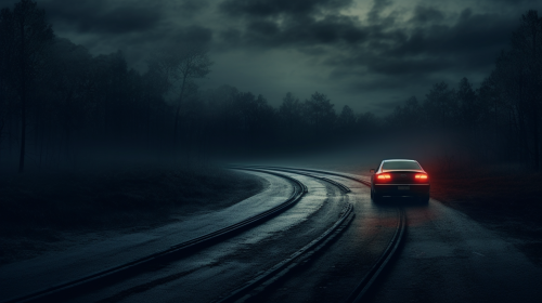 A man was driving alone on a remote road. He felt creepy. The picture showed the car driving forward and turning a corner.:: --aspect 16:9 --version 5.2 --seed 25678