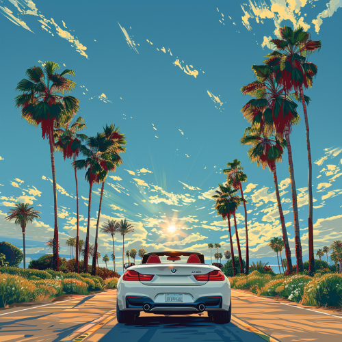 an illustration of a view of the horizon of a road from a black bmw convertible, the sun is shining straight ahead, full of light illuminating the sky, some palm trees around the road illustrator style --v 6.0 --s 750