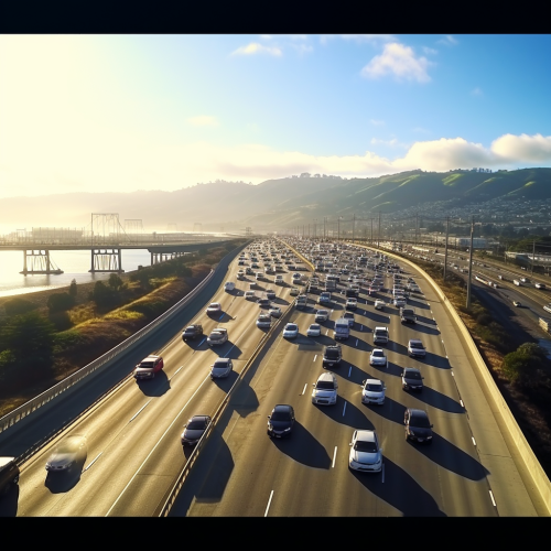 cinematic drone shot of a bay area freeway full of cars driving towards san francisco 4k hd