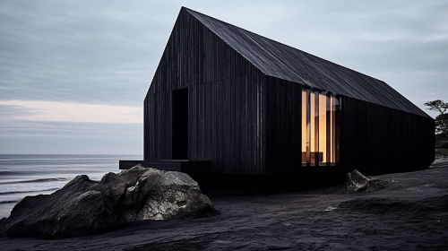 a cabin on the beach that looks like charred wood designed by Gilles Retsin --ar 16:9