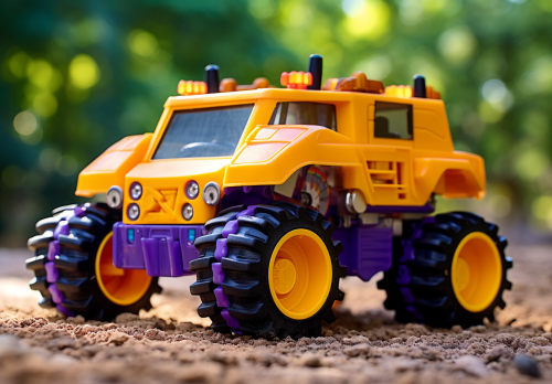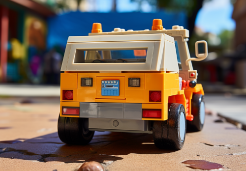 back view of a colorful child's toy remote controlled construction truck - rear view of a RC construction truck driving away from camera, straight on angle, falt, direct --ar 13:9