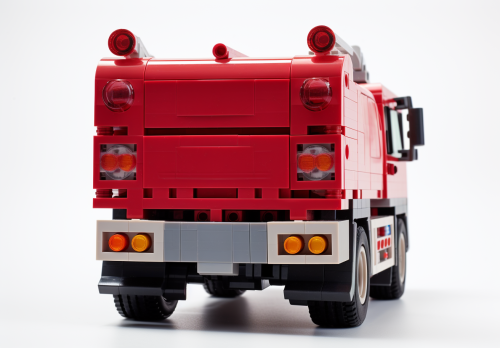 back view of a colorful child's toy remote controlled fire engine truck - rear view of a RC fire engine truck driving away from camera, straight on angle, falt, direct --ar 13:9
