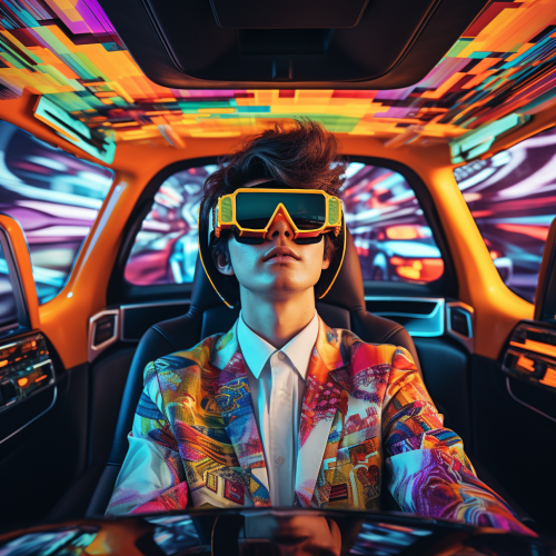 person driving futuristic car by wearing colourful cybernetic glasses