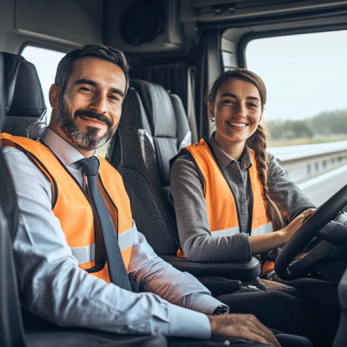A handsome Italian team of truck drivers, a man and a woman, sitting comfortably in the cabin of their semi truck's sleeper cab, smiling at the camera while driving on the highway. Both are wearing safety vests, with the man also in a tie, showcasing the professionalism and pride of those working in the transport industry.