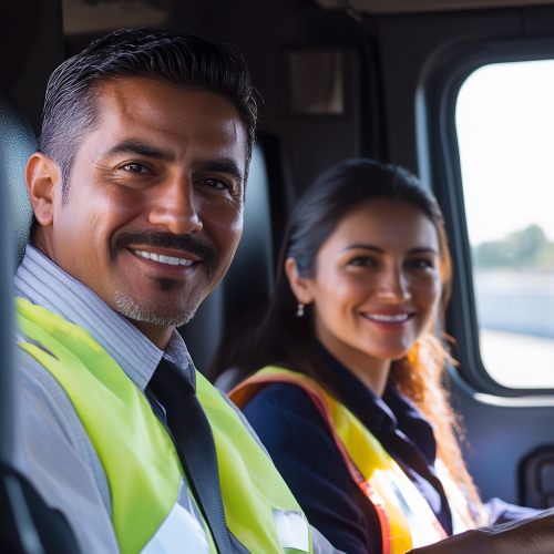 A 30years old handsome Latin team of truck drivers, a man and a woman, sitting comfortably in the cabin of their semi truck's sleeper cab, smiling at the camera while driving on the highway. Both are wearing safety vests, with the man also in a tie, showcasing the professionalism and pride of those working in the transport industry.