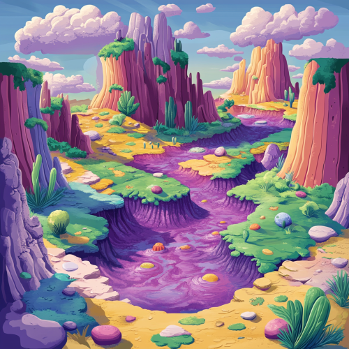 A colorful, playful background designed for a children's sticker collection book, featuring small circular and irregular spaces where toy figures could be placed as stickers. The scene is vibrant with a mix of fantastical landscapes – including grassy hills, a bubbling purple slime pool, and rocky caves, with areas of bright colors and cartoonish details. The style is inspired by 90s collectibles and toy packaging, with bold outlines, simple shapes, and a slightly retro feel. The background should be inviting and fun, with plenty of open space around each area for kids to imagine placing their collectible sticker figures.