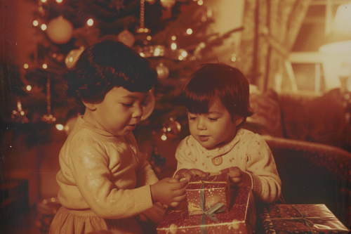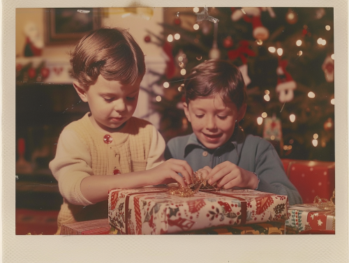 1960s-style Polaroid photo of two kids eagerly unwrapping Christmas gifts, cozy room setting. Christmas tree adorned with vintage lights and ornaments in the background, warm ambient lighting illuminating the scene. Muted colors, soft edges, and slight film grain add a classic, timeless feel. --style raw --ar 3:2 --v 6.0