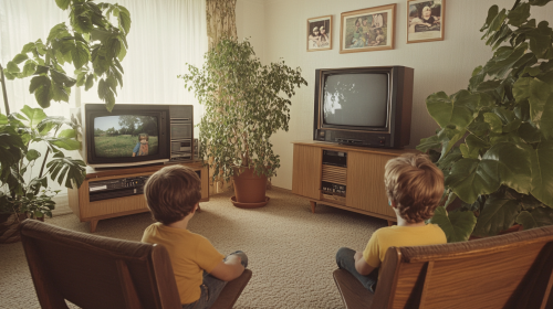 Late 1980s decor style magazine. Suburban home living room interior. Midcentury modern furniture. Carpet. Neighbourhood in the day. Natural lighting. House plants. Two young children watching TV. Photo frames. Serene and calm atmosphere. 80s camera filter --ar 16:9