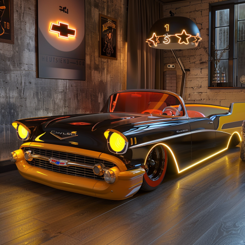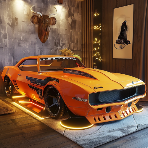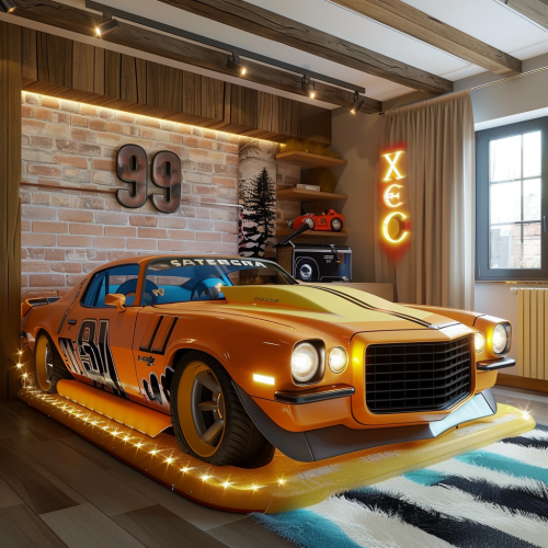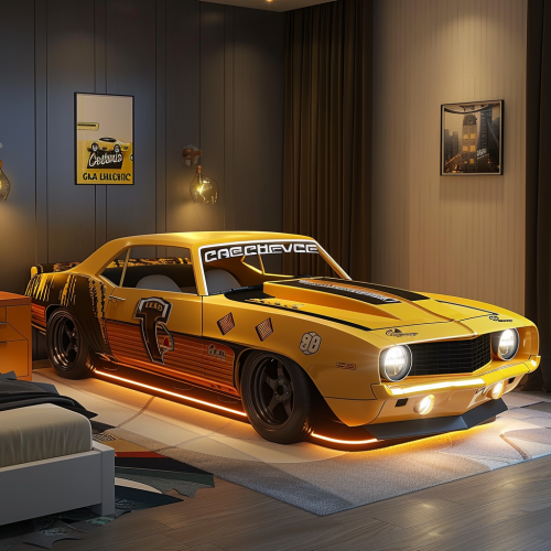 create a classic chevrolet camaro car bed, make it 3D perspective or side view bed , place inside a kids room with kids room background , include led lights--v 6.0