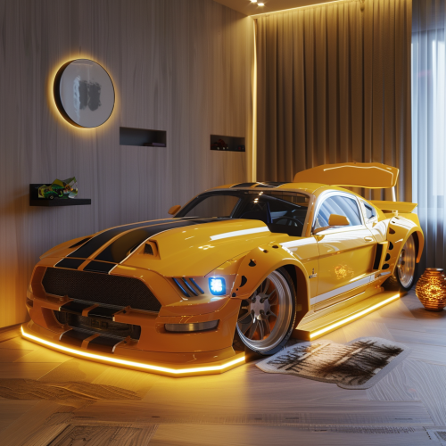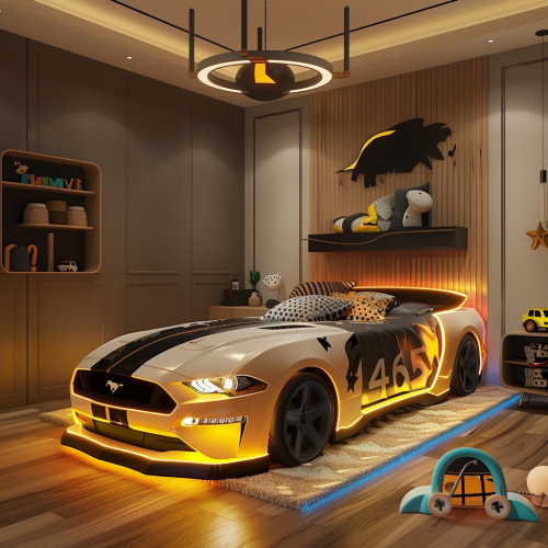 create a classic ford mustang car bed, make it 3D perspective or side view bed , place inside a kids room with kids room background , include led lights--v 6.0