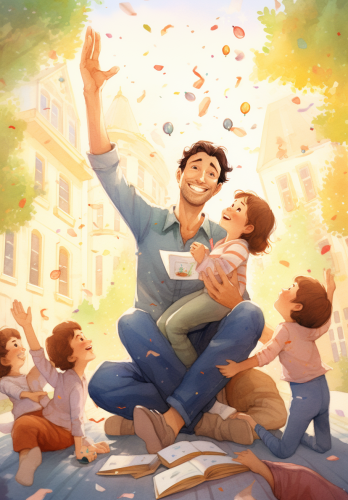 father playing with kids, children illustration book, watercolor style, in the style of nicholas hely hutchinson, sou fujimoto, school of london, pont-aven school, adventurecore --ar 9:13 --v 5.2