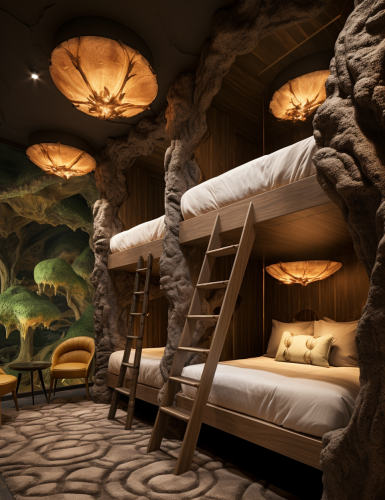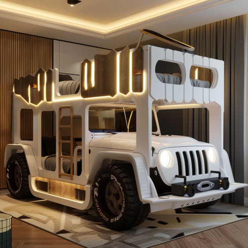create a jeep car bunk bed bed, make it 3D bed places inside a kids room with kids room background, include led lights