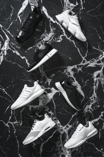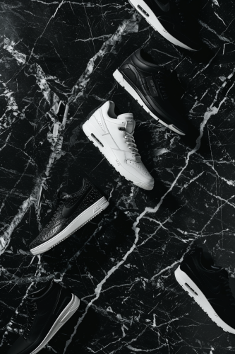 poster design of 6 different luxury black and white athletic shoes setting on black marble wall and floor with slight white texture display studio, ingle light source from the top, super dark tone, luxury feeling, hyper-realism, --ar 2:3 --v 6.0