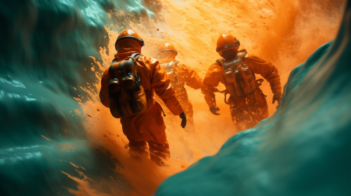 [1ba245bc2] An expedition team clad in orange down jackets and carrying white backpacks is caught in a swirling vortex of orange liquid, creating a cinematic, Nolan-esque atmosphere with shades of teal and orange. --v 5.2 --ar 16:9 --c 0