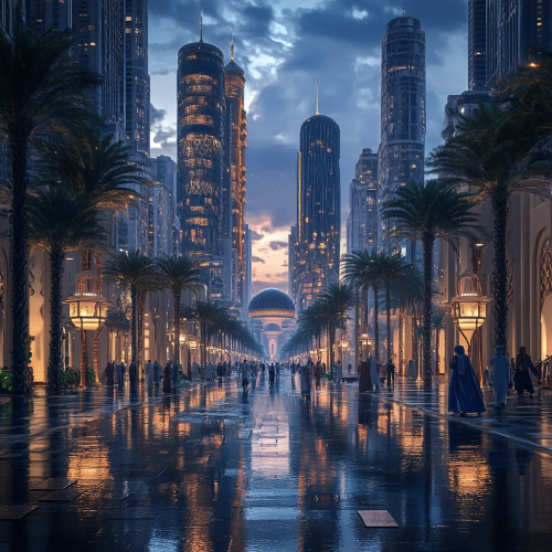 What Abu Dhabi looks like, fascinating, 2024s, imaginative, realistic, photographic of the city of Abu Dhabi, background Abu Dhabi city view, incredible, creative, city 3d render, city lights, Arabic people, rainy day