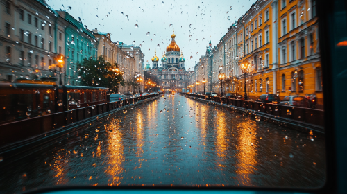 view from the window of an Tvisinter train, rainy day outside in St petersburg, view on victorian buildings and water with raindrops --ar 16:9 --s 750