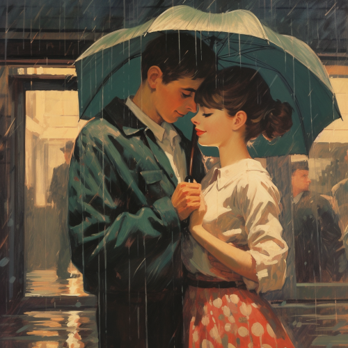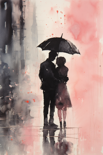 first love, rainy day, watercolor, Silhouette, 1960s --ar 4:6