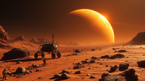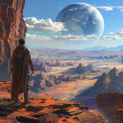 high resolution realistic photography, close up on the back of a human being, background is a dramatic valley landscape of a red planet with a human being wearing a white spacesuit with a golden helmet in the middle of the image. real mountain textures, dust. Dramatic light. --ar 16:9