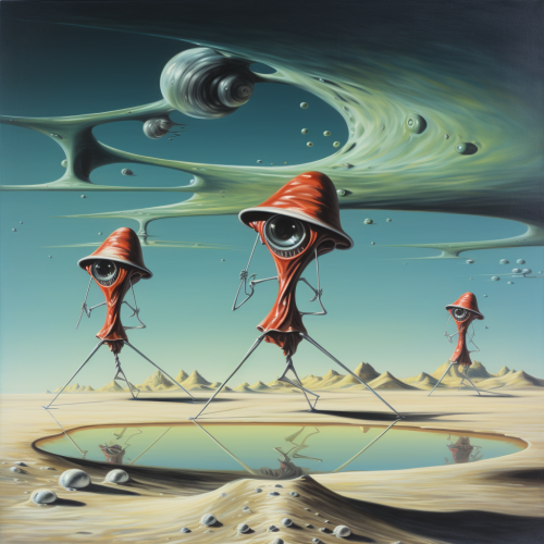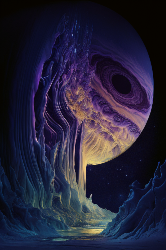 Mikalojus Konstantinas Ciurlionis's painting depicting Alien Contact on Planet Jupiter, Alien portrait, close up, Interplanetary Dimensional Beings, Dark Purple, Sapphire Neon Glow, HDR, ultra realistic, intricate details, high resolution, octane render, unreal engine 5, 8k, Ultra-HD,, --chaos 10 --ar 2:3 --v 4 --s 300 --upbeta