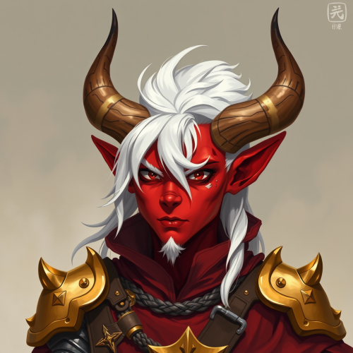 a shield emblazoned, with a Field Partitioned, with Portion Dexter Azure containing a pierced cinquefoil argent, with Portion Sinister Sanguine containing Garb d’Or, overset by a Tabaxi Regardant Tenne, all Supported.