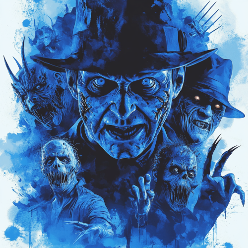 graphic design of group of scary freddy kruger side by side,various menacing poses, classic horror moviue poster style, apply a vibrant glowing blue filter over the entire image, the freddy krugers should be arranged in a dynamic eerie composition, hyperrealistic, 90s horror aesthetics, misty background around the dolls with white background, scary horror theme --s 250