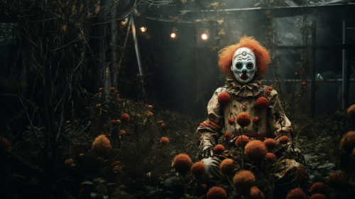 Luminous photograph, in a garden during the day, a creepy clown who no longer loves his robot --ar 16:9