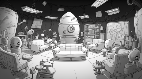 cushion inserts testing facility with lots of cushions around being tested. The facility is in outer space and the testers are aliens. Draw this in a line art style using only black and white. --ar 16:9