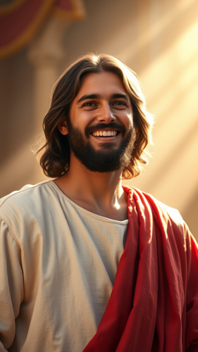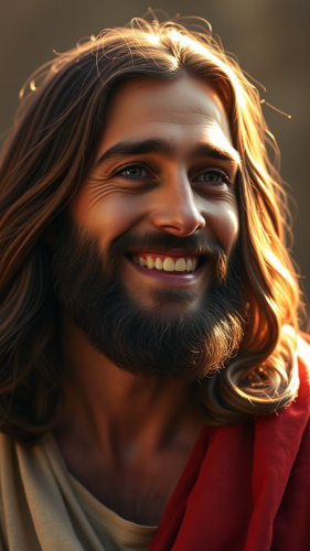 Create a serene and uplifting portrait of Jesus, depicting Him with a warm smile and compassionate eyes. He should be portrayed wearing a simple, flowing robe, with soft light illuminating His face. In the background, include a gentle landscape of rolling hills and blooming flowers, symbolizing peace and hope. The atmosphere should convey love and acceptance, inviting viewers to feel a deep connection with His message. Add subtle rays of light radiating from above to enhance the divine presence