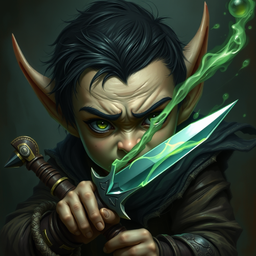 Sneaky male elf rogue in black leather armor holding one short dagger. Dark Fantasy setting. The mood is eerie and ethereal. Watercolor art style. The background is a medieval city back alley with some white space around the edges. --ar 3:7