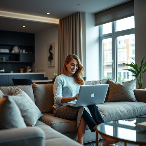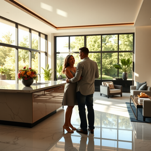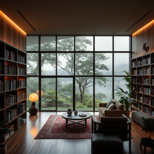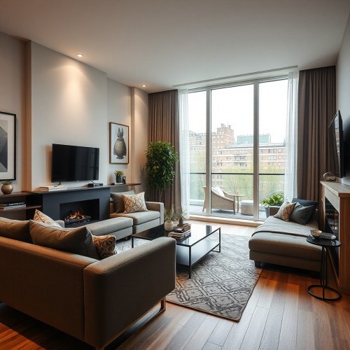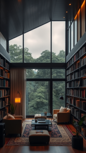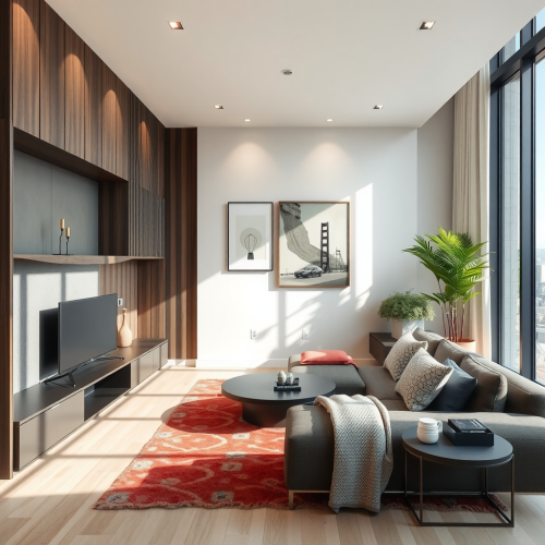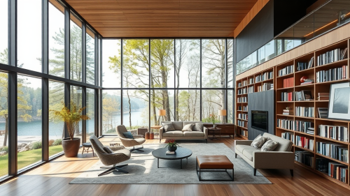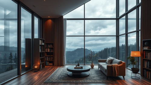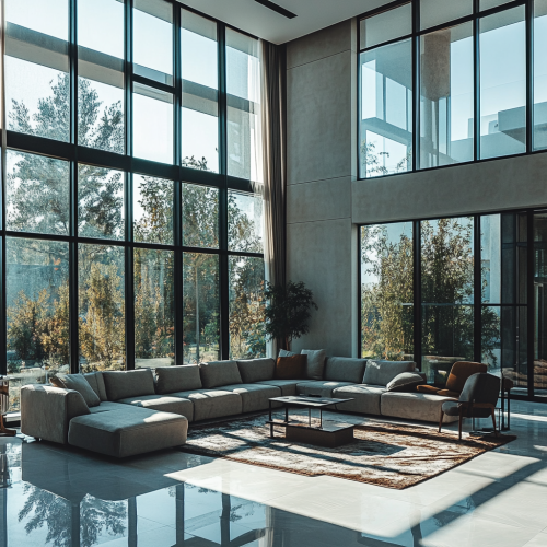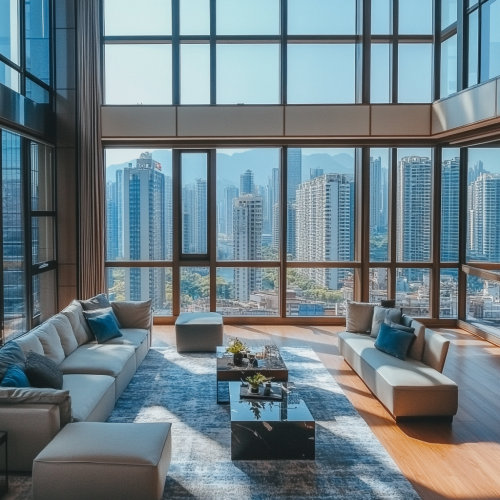 Premium interior space of a modern building, the photo should show a spacious and bright living room with floor-to-ceiling windows. The interior decoration style is mainly modern and simple, and the furniture is neat and comfortable, adding to the warmth of home and highlighting the high-end living choice