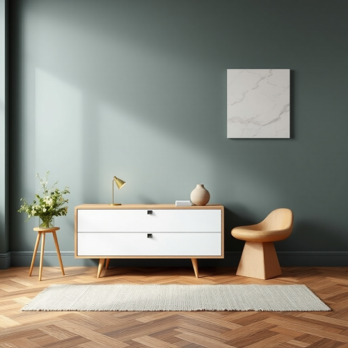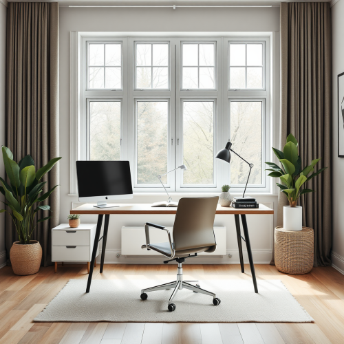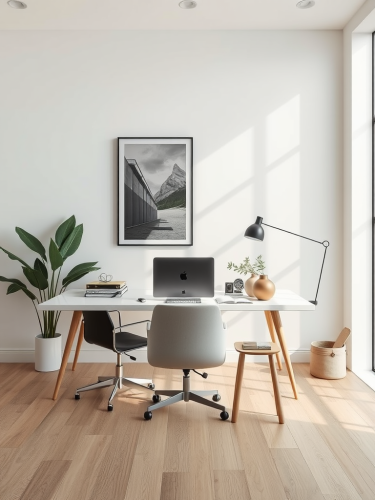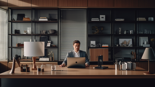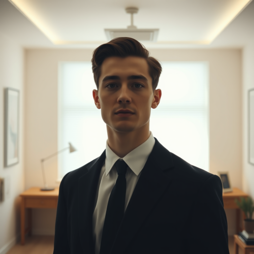 Modern minimal interior of a home office, standing is a young lawyer man, minimalist, filmic feel, Filmmed like inception, kodak film stock, ultra realism, high grain film image, bright lighting, color grading, large format film, Filmmed by Hoyte van Hoytema, --ar 16:9 --v 5.2 --style raw