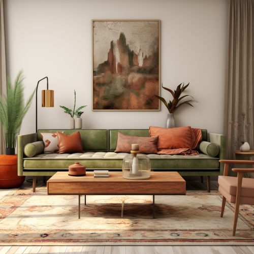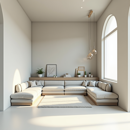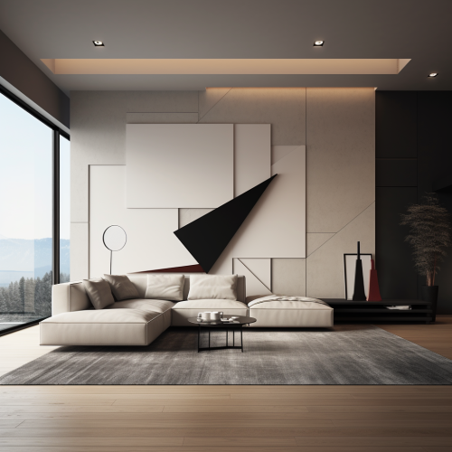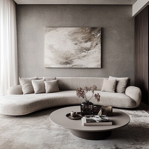 : Modern living room with a curved sofa, accent wall and round coffee table in a grey color with minimal furniture, a contemporary interior design of modern home decor in the style of accentual style. Minimalist aesthetic with muted colors.