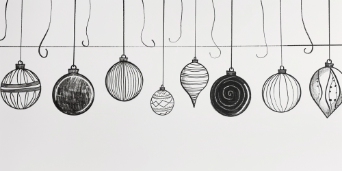 create a simple black and white line drawing of a string of christmas ornaments hanging, mid century modern aesthetic, sketchy style --ar 2:1