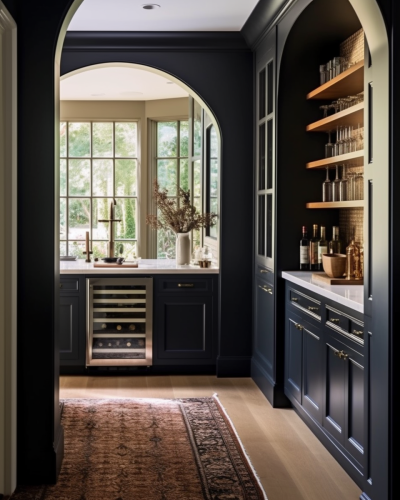 Honey Collins modern home mini-bar Interiors , modern colonial farmhouse. beige black --v 5.1 --ar 4:5 --s 750