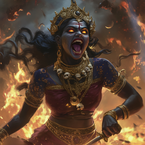 Devi Kali in her Raudra Roop, a powerful figure radiating the fury of battle and dignity of valor. Her fierce face, with her tongue distinctly protruding from her mouth, expresses her intensity and ferocity. Her dynamic form, crafted from the ethereal essence of divine energy and shadow, features deep, dark skin like a starless night, symbolizing chaos and transformative power. Her eyes burn with fiery crimson intensity, reflecting determination and an unyielding spirit. She wields a lethal Kalaripayattu sword, its blade flickering with ethereal flames. Around her neck hangs a prominent necklace of skulls, each representing a defeated demon, signifying her victories and fierce nature. The background is ablaze with flames, creating a dramatic contrast that enhances her formidable presence. Set against a stormy cosmic battlefield with swirling mists and flashes of lightning, this scene is painted in a dramatic, surreal art style with vibrant colors. Soft, ambient light creates an ethereal glow around her, captured from a low angle perspective to emphasize her imposing stature. The mood conveys strength and empowerment, with intricate patterns on her skin shimmering and her crown adorned with crescent moons reflecting her glorious conquests. The scale is grand, making her seem both majestic and fearsome, with textures ranging from the smoothness of her skin to the roughness of her sword and the intricate detail of her crown