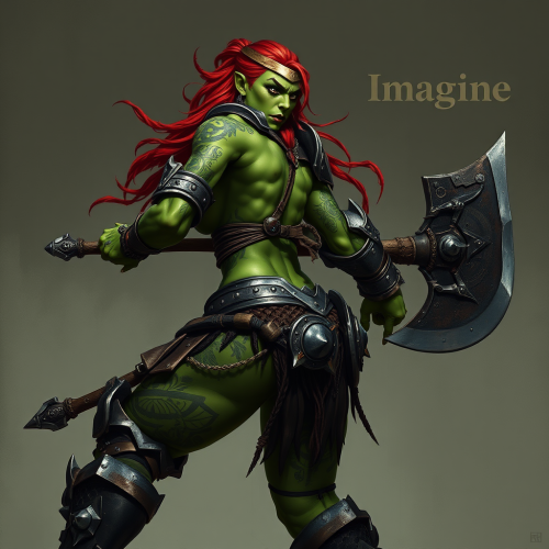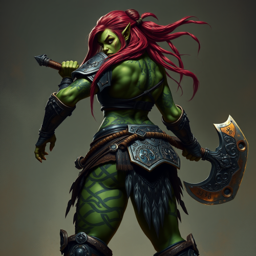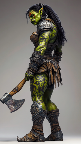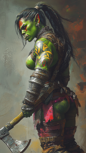 imagine a fierce female orc character, full view from leg to head glancing back over her shoulder, muscular build armour, vivrent color style axe in hand intricate tribal tattoos, vibrant green skin, depicted in an epic fantasy art style, dramatic lighting, detailed textures intricately designed armor,, dynamic pose, high detail, dramatic lighting --no background --ar 9:16 --v 6.1